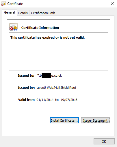 When you use Avast Antivirus it installs an invisible proxy SSL Certificate Authority that allows it to scan SSL/TLS traffic with its antivirus engine. The downside to this is that all certificates appear to be signed by avast! Web/Mail Shield Root and can make things confusing at first glance when a SSL certificate is out of date.